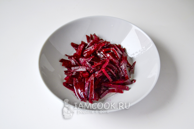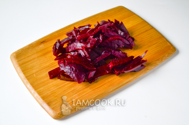 Готовую и охлажденную свеклу очистите и нарежьте тонкой соломкой.