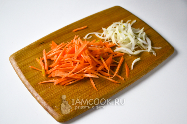 Морковь нарежьте тонкой соломкой или натрите на терке для корейских салатов, или на крупной терке. Лук нарежьте тонкими полукольцами.