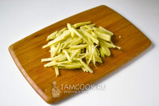 Половину кисло-сладкого яблока очистите от кожуры, удалите семенную камеру и нарежьте тонкой соломкой.