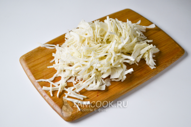 Капусту нарежьте тонкой соломкой. Чуть посолите и немного помните руками, чтобы капуста стала чуть мягче и дала сок.