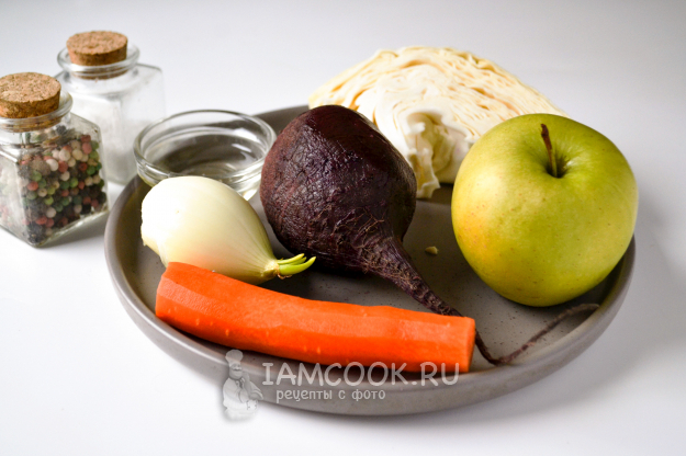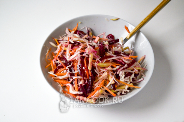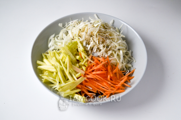 В миску со свеклой положите капусту, морковь и лук. Посолите и посыпьте черным молотым перцем.