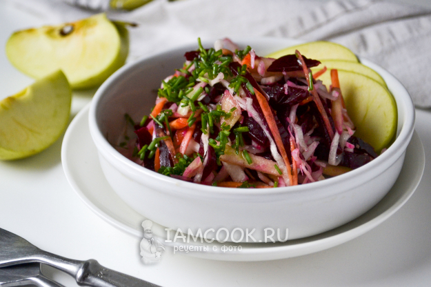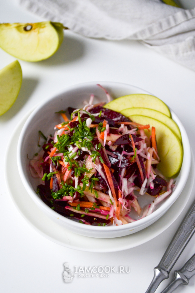 Положите свеклу в миску, полейте растительным маслом и перемешайте. Я так делаю, чтобы в готовом салате свекла не окрасила другие продукты.