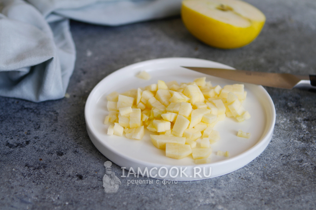Тщательно моем яблоко, вытираем его бумажным полотенцем. Делим его на две половинки. Одну часть яблока убираем, а из второй удаляем сердцевину с плодоножкой, по желанию снимаем кожуру. Нарезаем яблоко кубиками или ломтиками, кому как удобно и привычно.