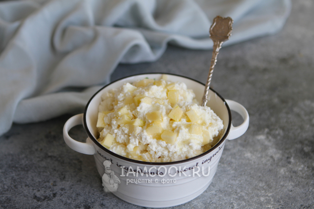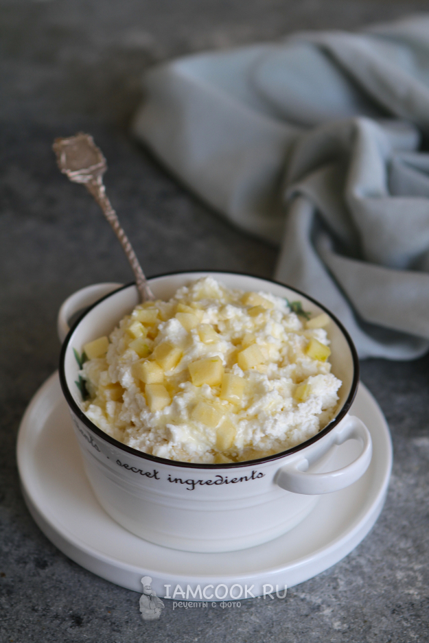 Идеальный вариант вкусного и полезного завтрака из творога с яблоком готов. По желанию блюдо можно присыпать семечками или корицей.