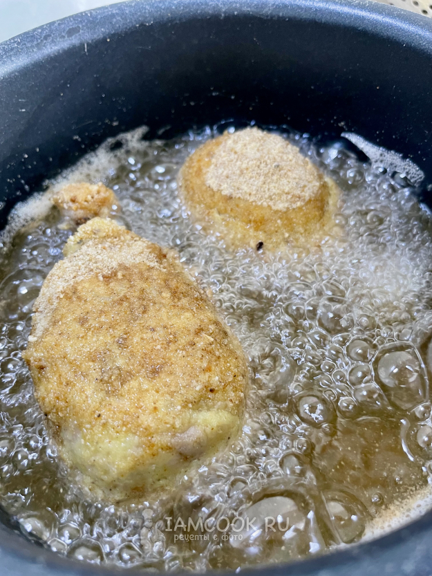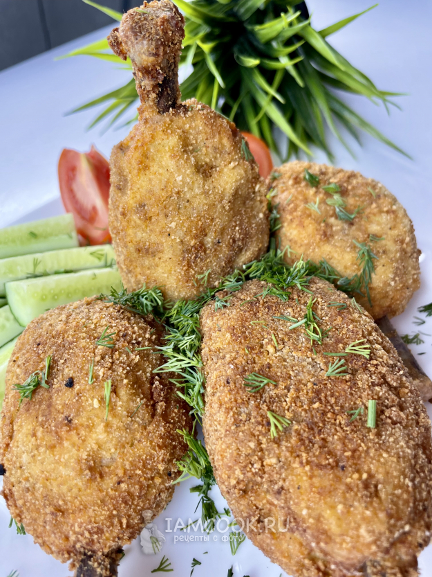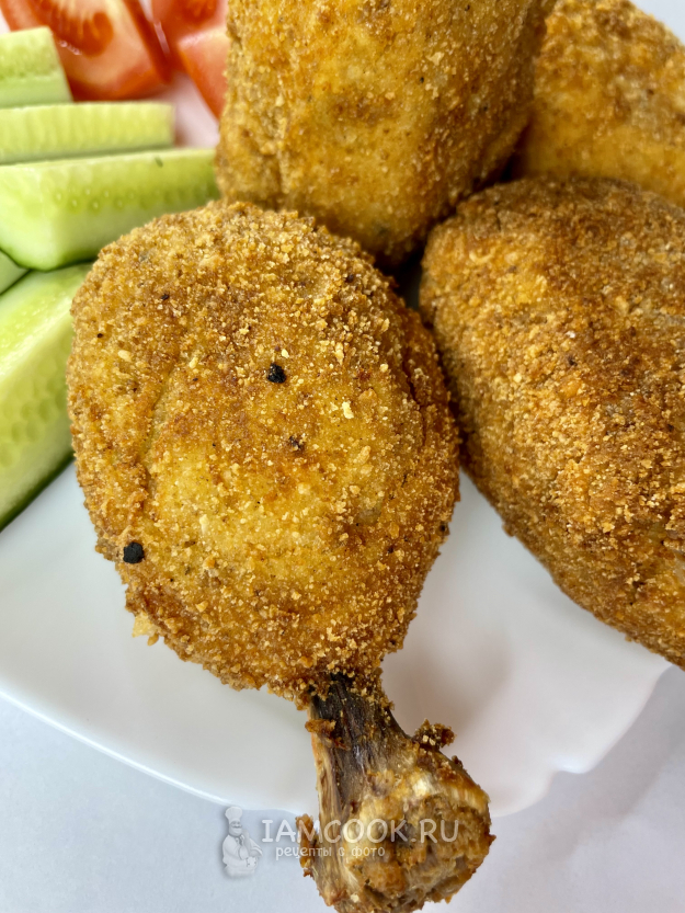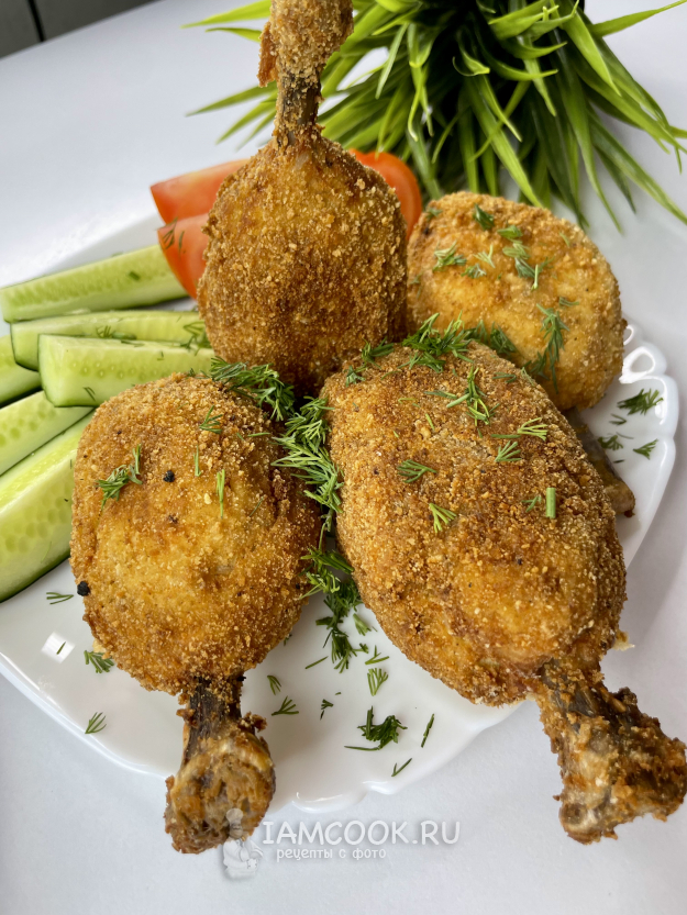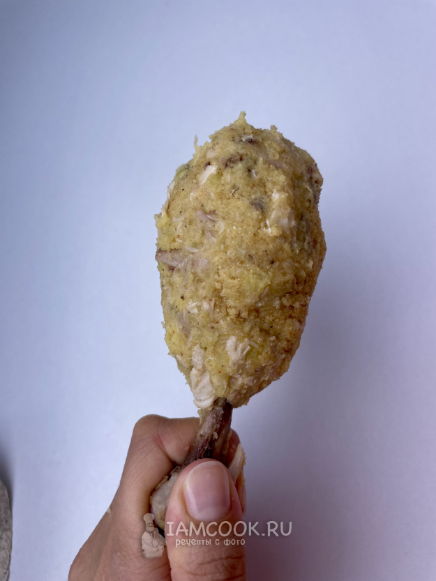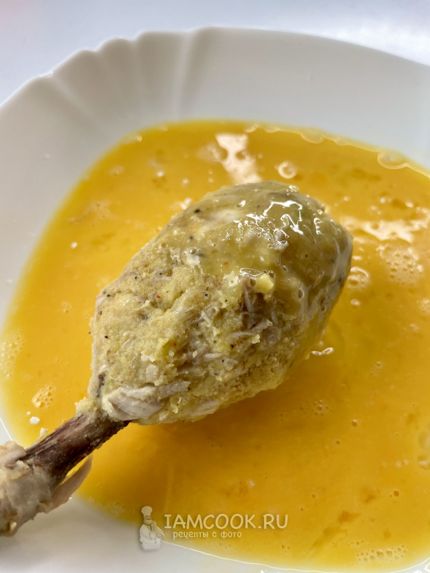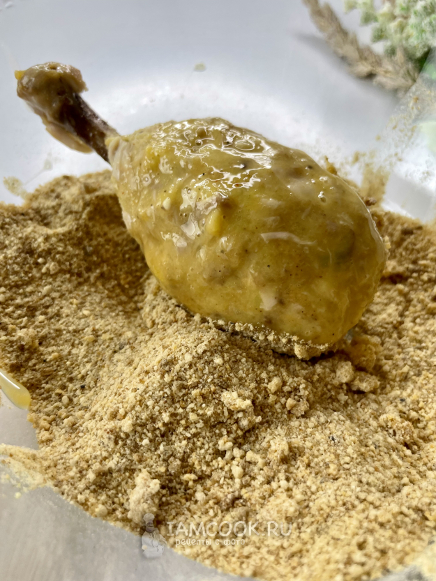 Обваливаем ножку в муке, затем в яйце и в панировочных сухарях.