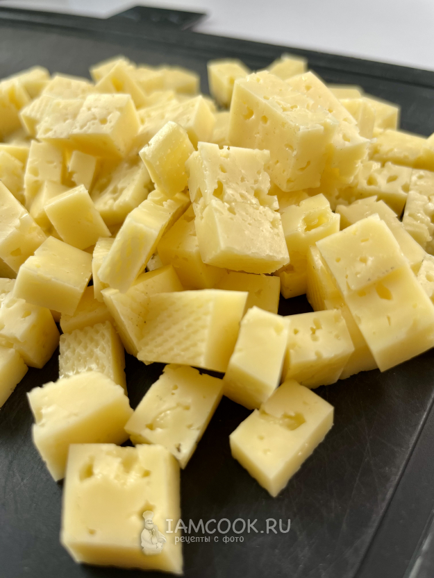 Сыр нарезаем на небольшие кубики.