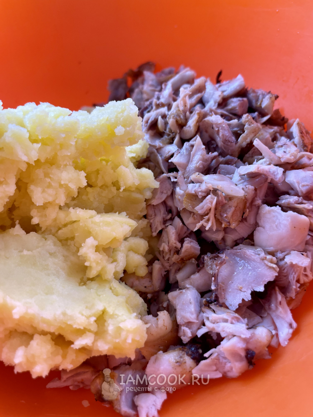 Смешаем пюре и мясо. Добавляем соль (1/2 ч.л.), перец черный (1/2 ч.л.), копченную паприку (1/2 ч.л.) и яйцо. Перемешиваем руками.