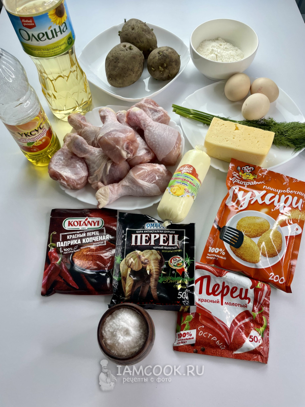 Для приготовления куриных ножек в картошке соберем все необходимые ингредиенты по списку.