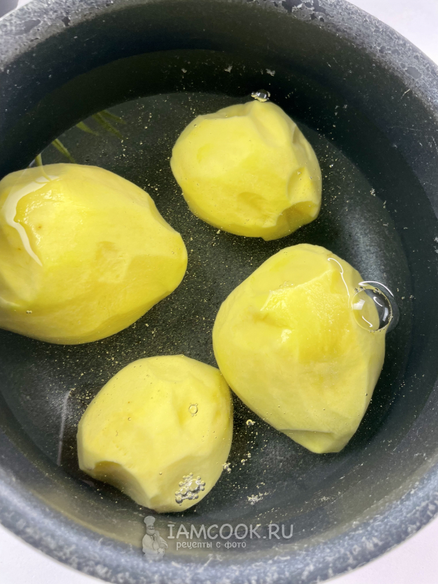 В кастрюлю отправляем картофель. Добавляем соль (1/2 ст.л.), заливаем водой и готовим на слабом огне 40 минут.