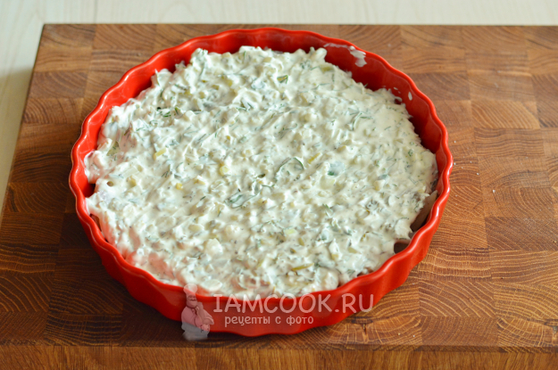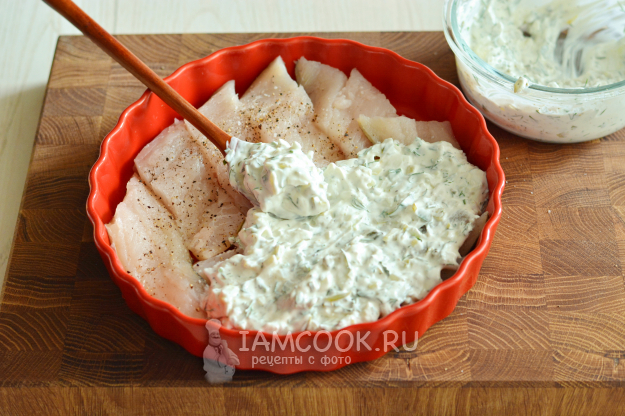 Сверху на рыбу выложите толстым слоем готовый соус "Тартар".