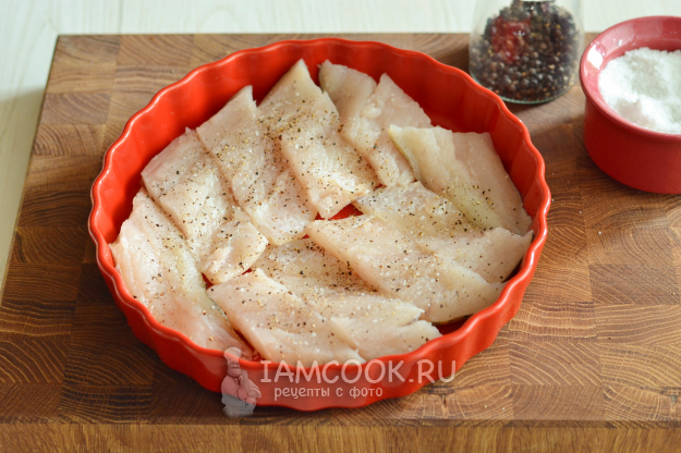 В форму для запекания выложите нарезанное рыбное филе кожей вниз. Приправьте рыбу по вкусу солью и перцем.