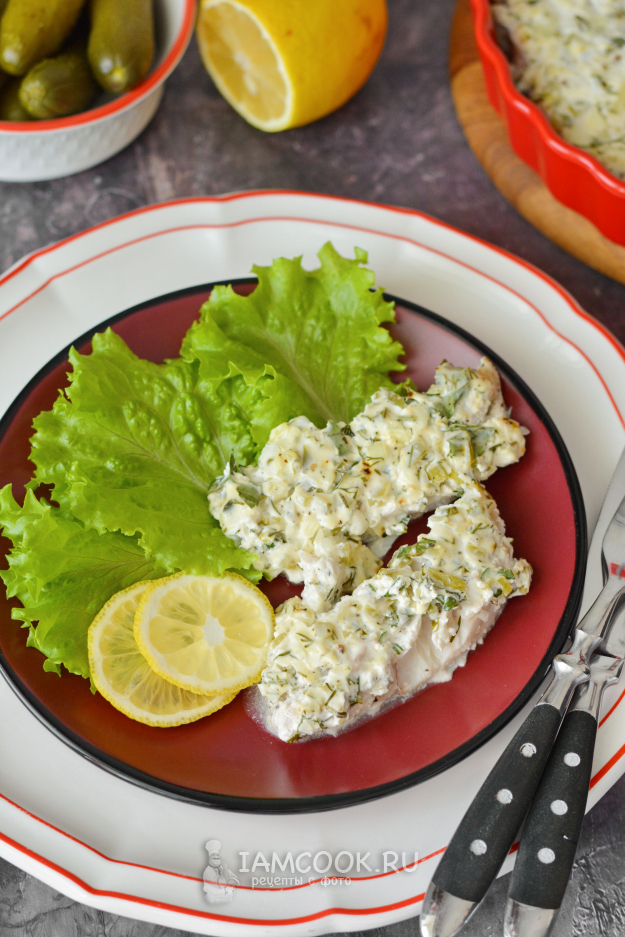 Отправьте всё в разогретую духовку. Запекайте рыбу под соусом «Тартар» в духовке примерно 15-20 минут при температуре 190-200°С.