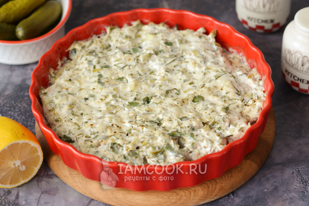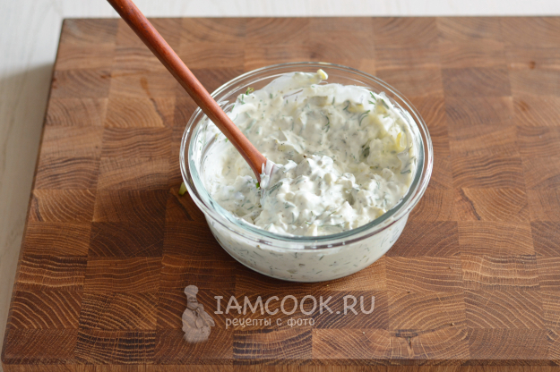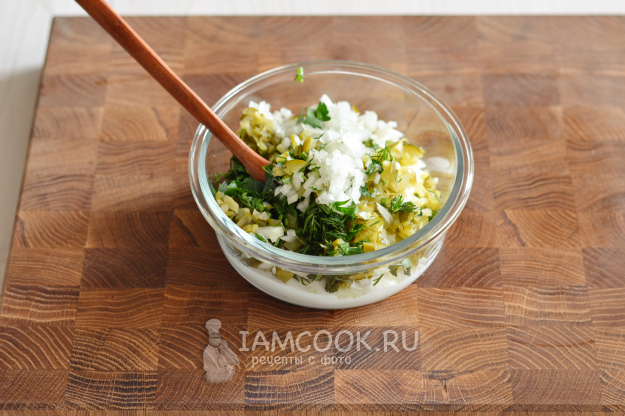 Для него очень-очень мелко нарубите ножом лук, корнишоны и зелень. В миску положите нежирную сметану и пару ложек майонеза. Добавьте всё, что нарубили, и перемешайте.