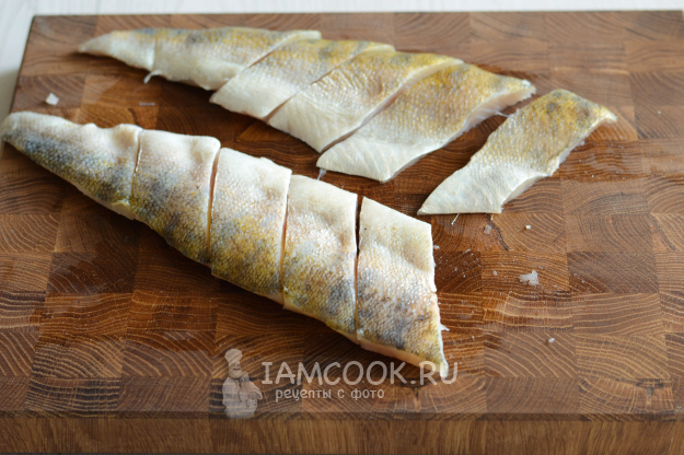 Нарежьте рыбное филе на кусочки шириной примерно 3-4 сантиметра. Кусочки рыбы не должны быть узкими, чтобы соус на них хорошо задерживался.