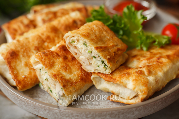 Готовый лаваш с курицей и сыром выкладывайте сначала на бумажные полотенца, чтобы убрать излишки масла, а затем – на блюдо для подачи.