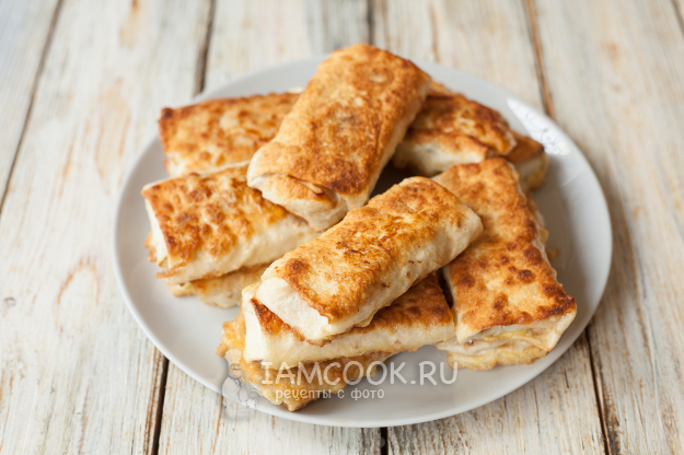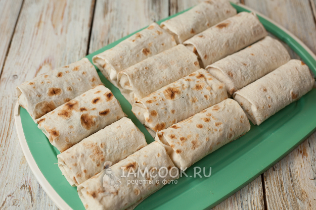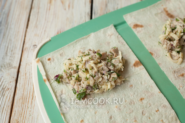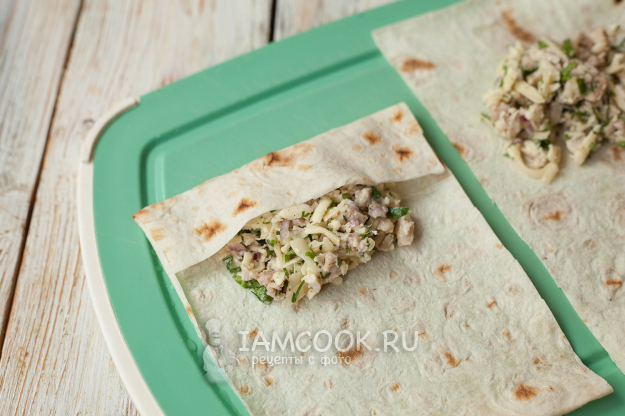 А затем заверните начинку в лаваш по направлению к свободному краю. В принципе, лаваш можно завернуть по-всякому: и треугольниками, и трубочками – как больше нравится, лишь бы начинка никуда не «убежала» при жарке.
