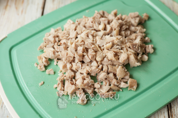 Первым делом сварите курицу: поместите филе в кипящую подсоленную воду (для более насыщенного вкуса можно добавить специи – душистый и/или черный перец горошком, лавровый лист, небольшую почищенную репчатую луковицу и пр.). Варите 25-30 минут после повторного закипания воды (до полной готовности куриного мяса). Также курицу можно обжарить или запечь, предварительно натерев приправой и солью. Готовую курицу выложите на тарелку, дайте ей остыть, а потом порежьте на мелкие кусочки.