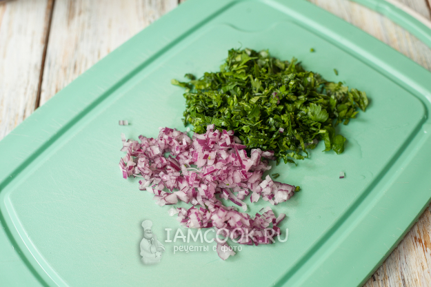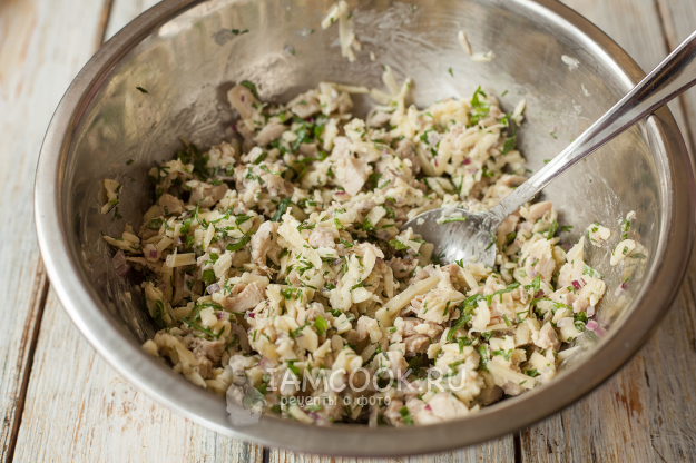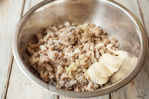 Смешайте курицу, сыр и зелень в одной миске, добавьте пропущенный через пресс чеснок, соль, перец и майонез.