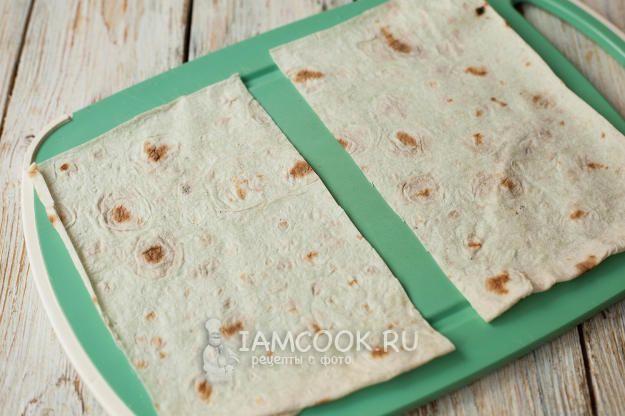Нарежьте каждый лист лаваша на прямоугольники длиной 20-22 см и шириной 10-12 см (это все примерно, потому что размер лаваша у разных производителей может сильно отличаться, плюс углы у лаваша могут быть как идеально прямыми, так и сильно скругленными). У меня получилось 12 прямоугольников.
