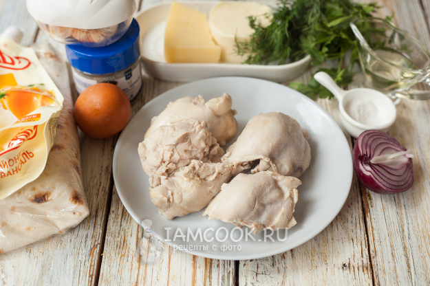Перед вами все продукты, которые понадобятся для приготовления лаваша с курицей и сыром на сковороде. У меня была уже вареная курица, в готовом виде ее вес составил 250 г. Я взяла филе бедра без кожи, также можно использовать и грудку или вовсе взять копченую курицу и не возиться с ее варкой. Вместо салатного лука можно положить в начинку небольшой пучок зеленого.