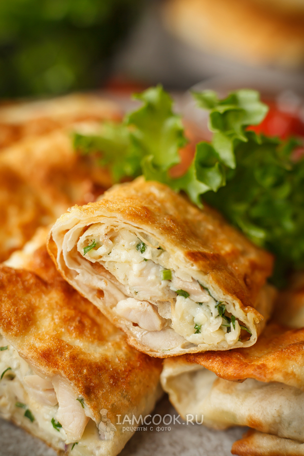 Нагрейте в сковороде растительное масло (столько, чтобы оно полностью покрывало дно сковородки тонким слоем). Окунайте конвертики сначала в яйцо, затем выкладывайте жариться. Готовьте лаваш с курицей и сыром на сковороде по 2-3 минуты на среднем огне с каждой стороны. Можно обжарить лаваш и без яйца, тогда корочка получится более хрустящей, а не мягкой.