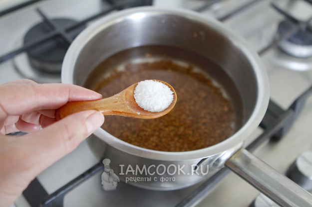 Дождитесь, когда закипит вода, слегка посолите гречку. Отрегулируйте огонь, выставьте ниже среднего, и варите гречку примерно 15-20 минут, до полного испарения воды. В процессе гречку не перемешивать. Как только выкипит вся жидкость, убавить огонь до минимума, сотейник закрыть крышкой и оставить кашу под крышкой еще на 5-7 минут.