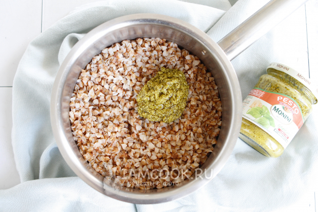 Затем добавьте 3 ст.л. соуса песто и перемешайте. Масло я не добавляю, так как в соусе оно есть и этого количества для каши будет вполне достаточно.