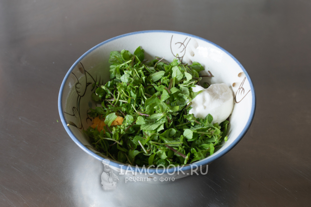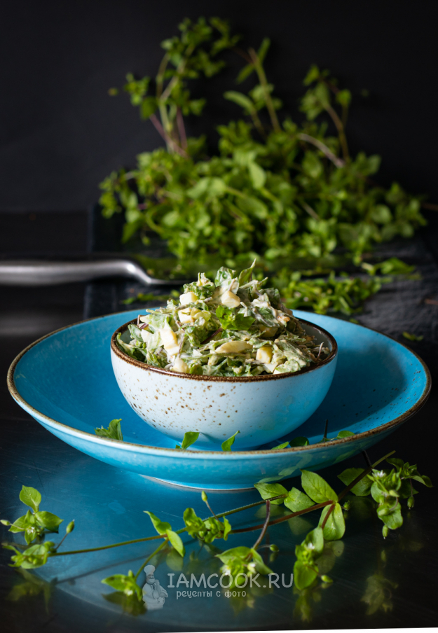 Дальнейшее зависит от того, какой именно салат вы собираетесь делать. Мокрица может работать и как лук-резанец, и как обычный салат (и идёт в салаты с аналогичным составом ингредиентов, заменяя то или это).