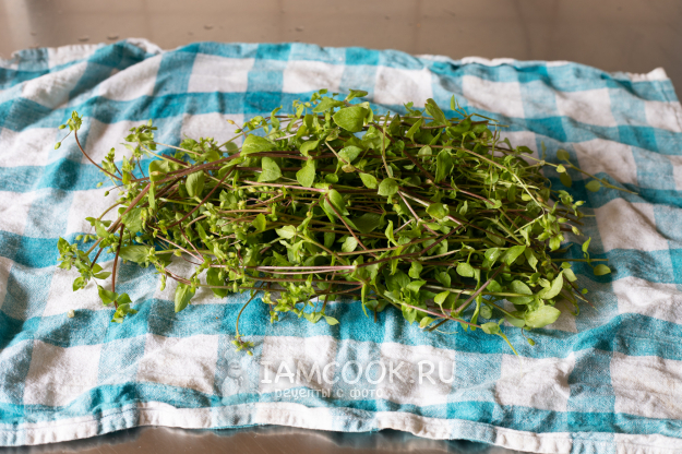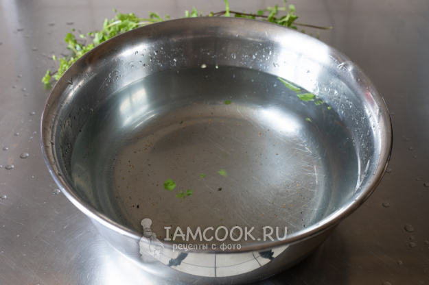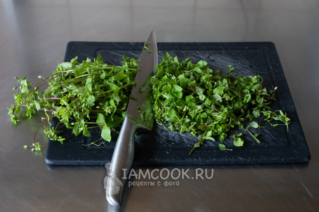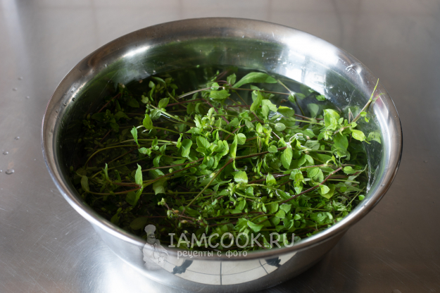 Мыть мокрицу следует в просторной ёмкости в большом количестве воды. Не мешайте её, удерживайте структуру пучка такой, как вы его сорвали - удобнее будет потом резать.