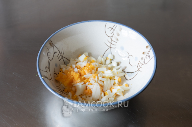Пока яйца варятся, режем мокрицу фрагментами длиной 2-3 сантиметра.