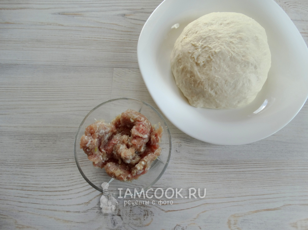 Для начинки я использовала обычный мясной фарш, который остался от приготовления пельменей, с луком, солью и перцем.