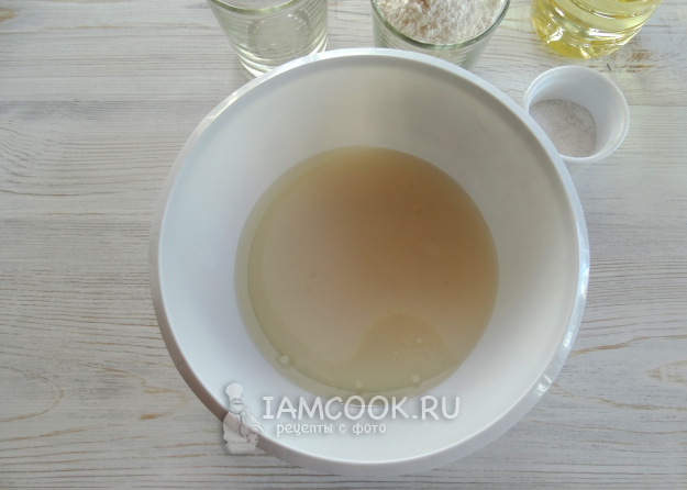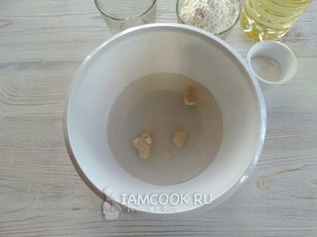В миску насыпать сахар, положить дрожжи, налить тёплую воду.