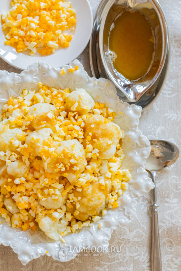Ну, и всё, что нам теперь нужно сделать - слить воду с цветной капусты и сервировать капусту на блюде, политую маслом с сухарями и посыпанную рубленым яйцом.