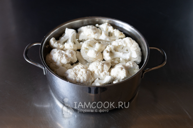 Цветную капусту разломаем на соцветия и отварим в слегка подсоленной воде 12 минут с момента закипания (ну, или как любите вы).
