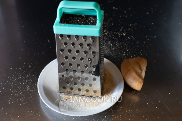 Пока варятся капуста и яйца, потрём на тёрке сухарь (у меня на получение трёх столовых ложек ушло полбулочки).