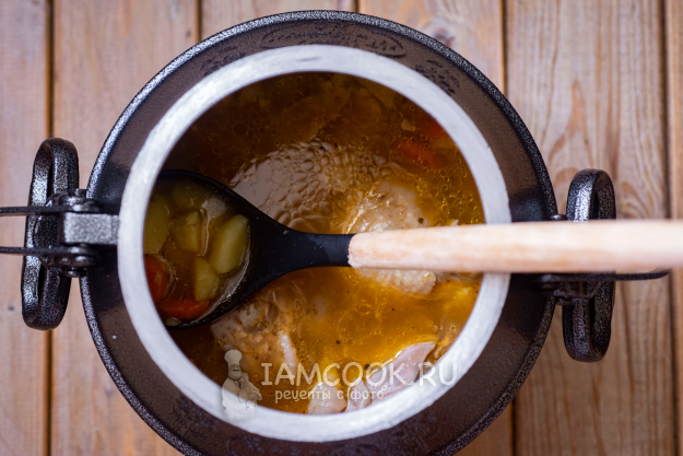 Герметично закройте заполненный казан крышкой и поставьте на плиту, включив максимальный огонь. Как только из клапанов пойдет пар, сразу же убавляйте уровень огня до минимального и так оставьте. Готовьте курицу с картошкой в афганском казане в течение 50 минут с того момента, как пошел пар.