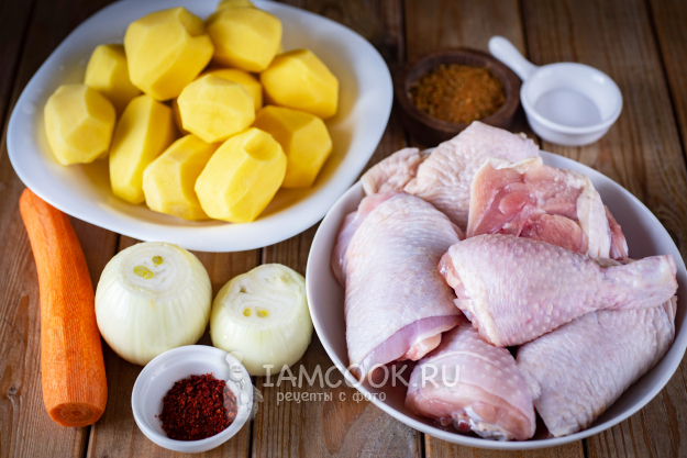 Соберите все ингредиенты для приготовления курицы с картошкой в афганском казане. Картофель, морковь и лук почистите и помойте. Куриные части ополосните в холодной проточной воде.