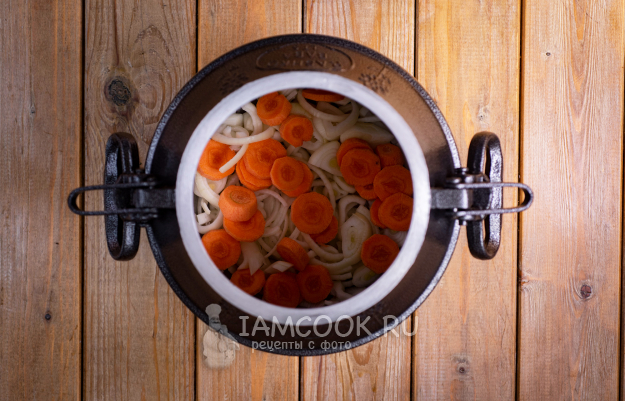 На дно казана выложите лук, морковь.