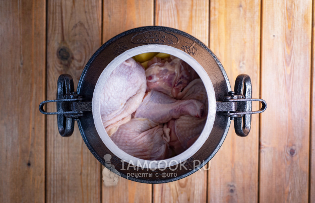 Выложите часть (можно побольше, а можно и половину) картофеля и поверх разложите все куриные части.