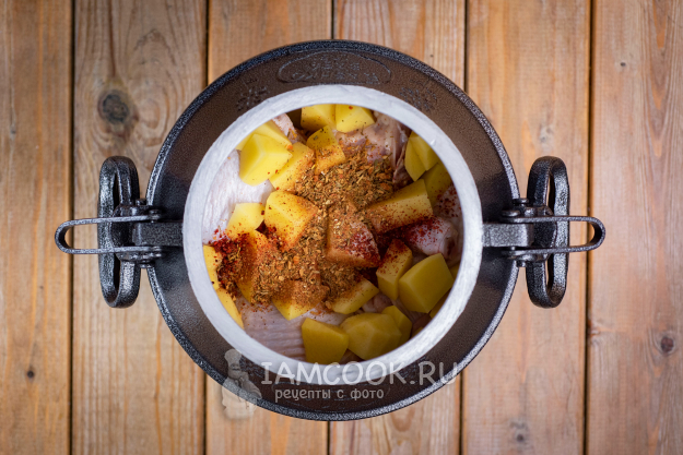 Поверх курицы выложите оставшуюся часть картофеля, добавьте соль, паприку, другие специи, залейте водой.