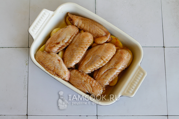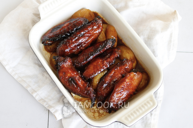 А на картофель уложите крылышки и влейте соус. Отправляем форму в заранее разогретую духовку при 165 градусах на 30-35 минут. По истечении времени достаем форму и переворачиваем крылья. Со дна формы аккуратно зачерпните соус и полейте крылышки. Отправляем снова в духовку на 30-35 минут. Температуру я не поднимала и вот по какой причине: при этой температуре крылышки будут медленно запекаться, и мясо будет сниматься с косточек буквально одним движением. Ну и картофель пропитается соком крылышек, получится мягким и ароматным.