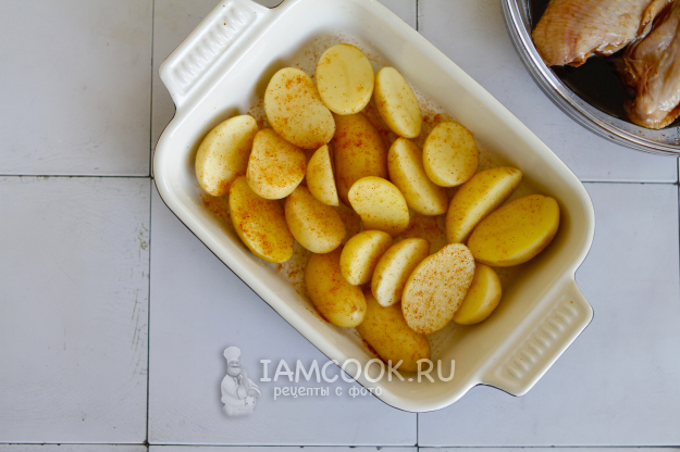 Подготовьте подходящую форму для запекания. Выложите картофель. Я слегка присыпала картофель приправой для курицы.