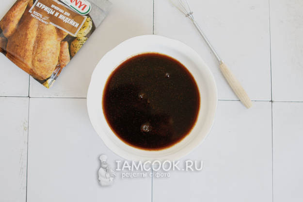 Для маринада смешайте соевый соус с медом и добавьте приправу для курицы. Соль я не добавляла, потому что соевый соус и без того соленый и в приправе для курицы соль присутствует.