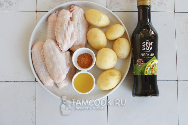 Соберите все продукты по списку и приступим к приготовлению крылышек в медовом соусе с картошкой.