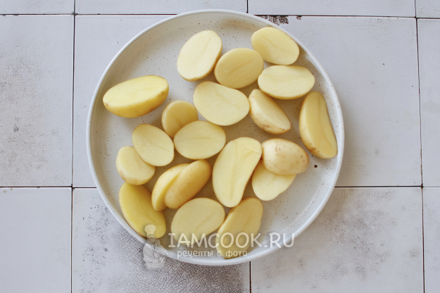 Подготовьте картофель. У меня молодой картофель и некрупный, поэтому клубни я разрезала на две половинки. Картофель предварительно не отваривала.