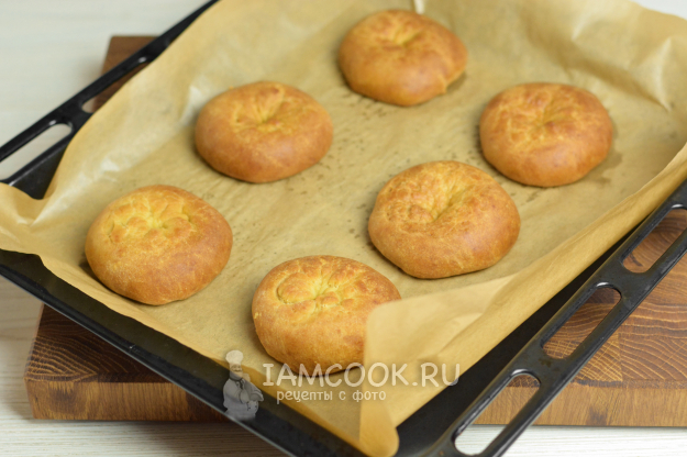 Лепёшки выложите на противень, застеленный пергаментом, и отправьте в разогретую духовку.