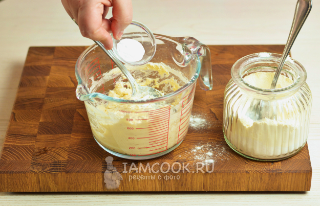 Как только тесто станет вязким и ложка будет с трудом проворачиваться, всыпьте соду и хорошо вмешайте её.