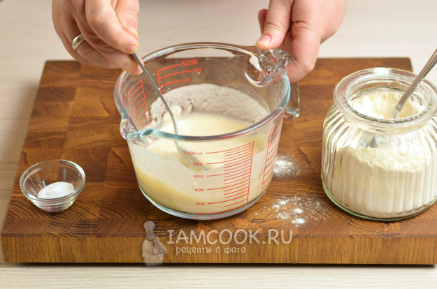 Теперь начните постепенно вводить в рассол муку, вмешивая её ложкой. За один приём вводите 1-2 столовых ложки муки, и как только вмешаете муку, добавляйте следующую партию.