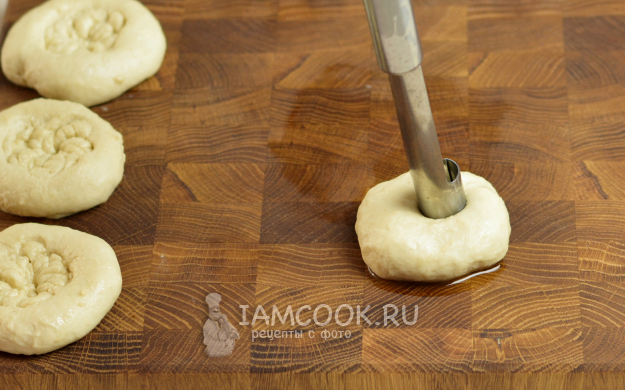Руками слегка приплюсните лепёшки, и центр наколите вилкой или, например, прибором для удаления сердцевины яблок.