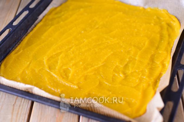 Противень застелите качественным силиконизированным пергаментом, поверх выложите тыквенно-яблочное пюре, разровняйте ложкой по всей поверхности слоем толщиной примерно в 2 мм. Сушите пастилу примерно 6 часов в духовке при температуре 80 градусов, приоткрыв совсем немножко дверцу в процессе сушки (вставьте металлическую ложку между дверцей и плитой). Показателем готовности пастилы будет то, что она почти не липнет к рукам (может, совсем чуть-чуть) и прекрасно отходит от пергамента. Поэтому если вам покажется, что пастила еще не готова, то увеличьте время сушки и проверяйте регулярно готовность.